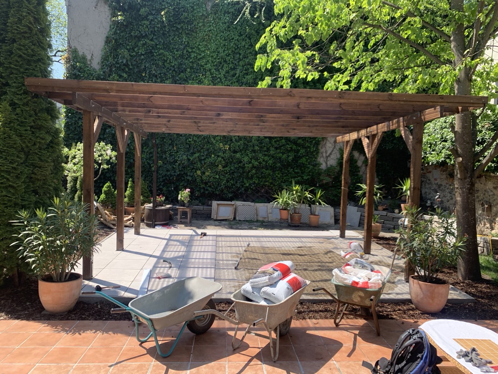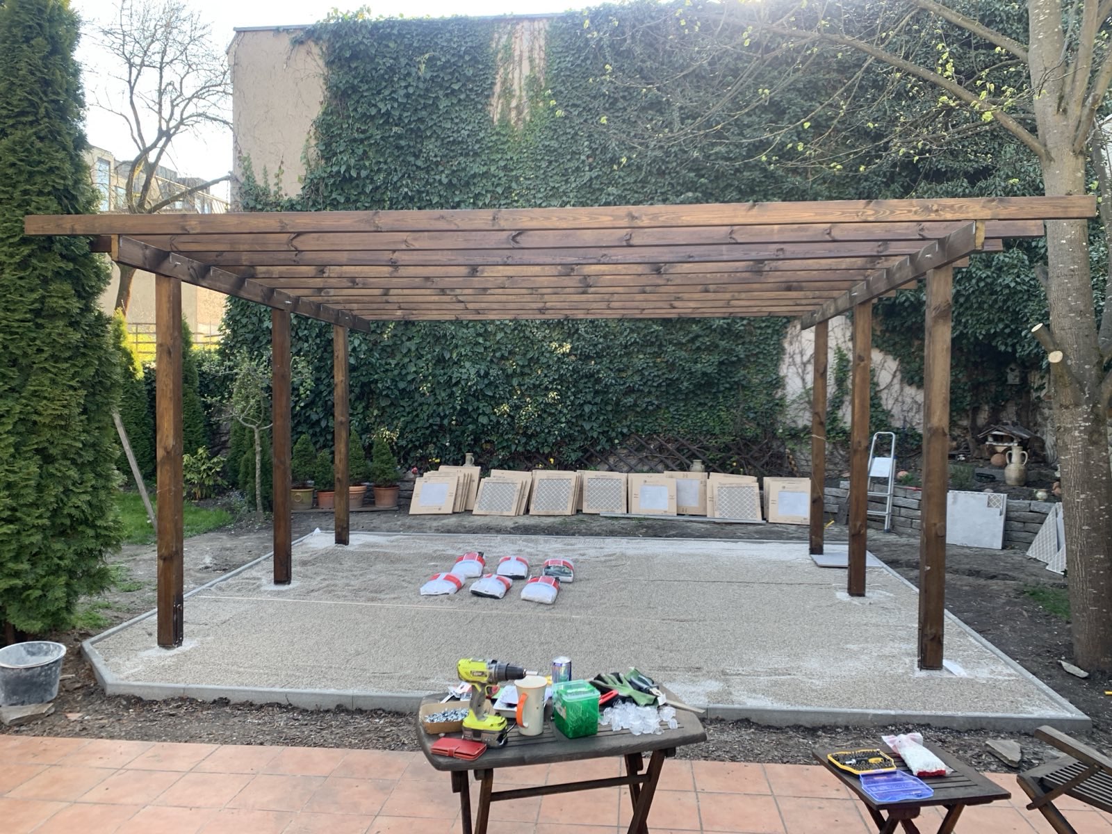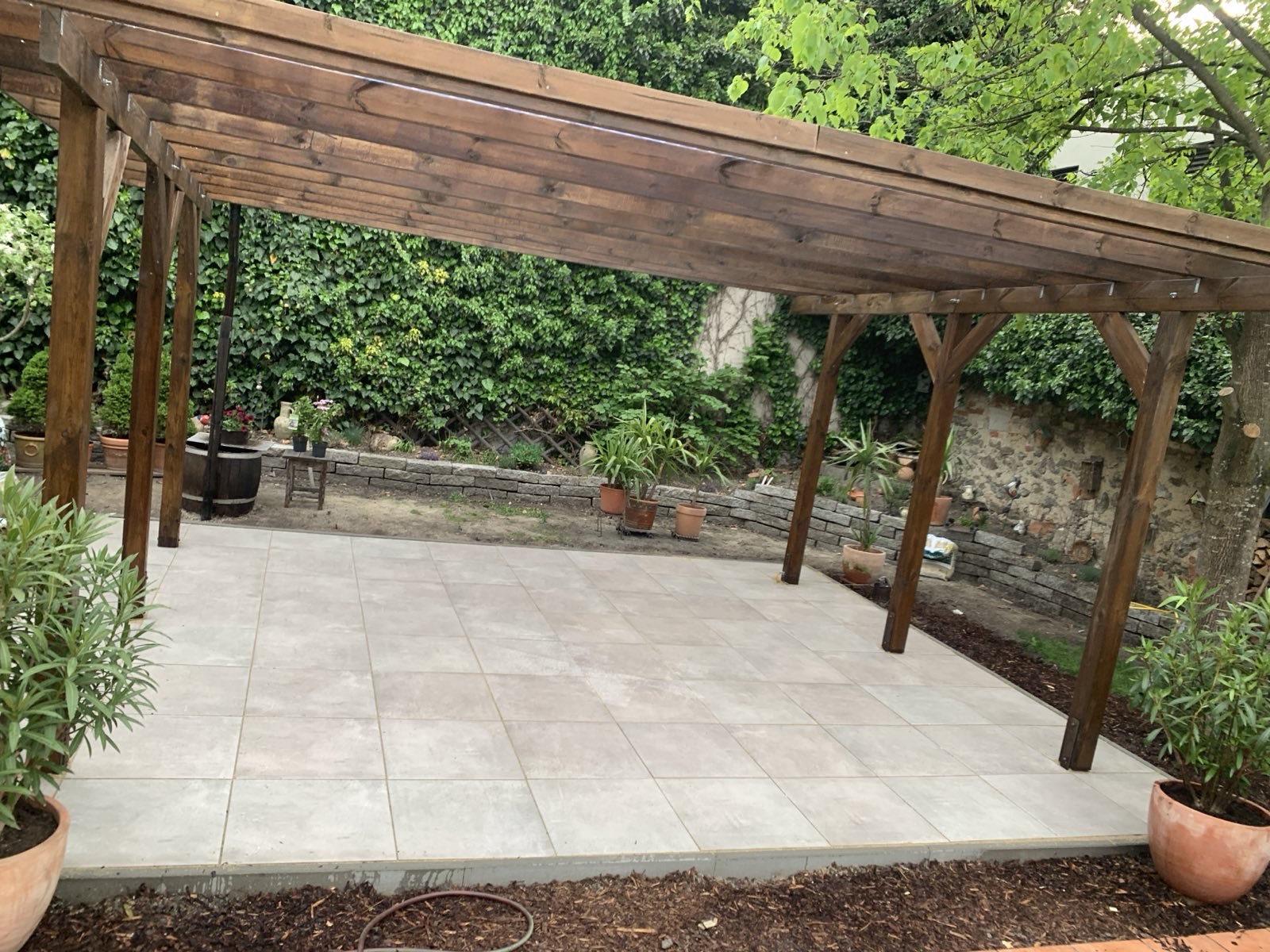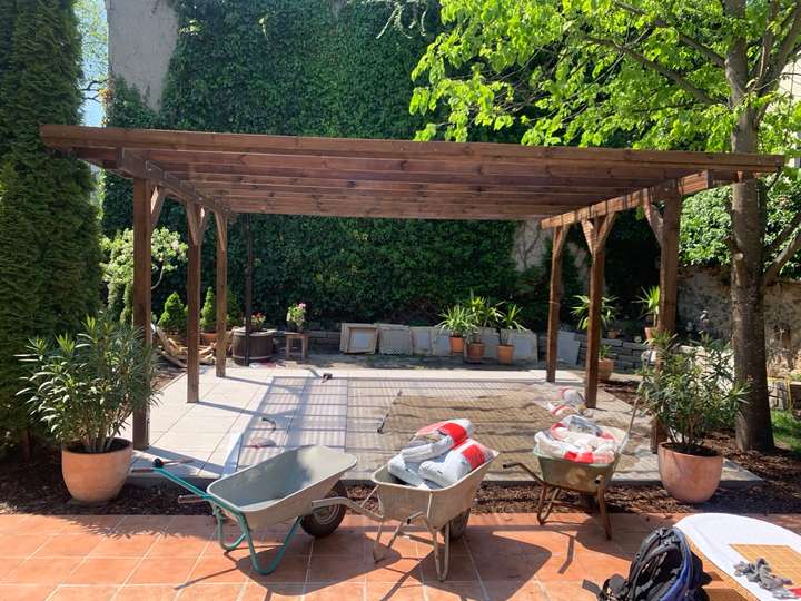 Es gibt Anlässe da kann die größte Pergola nicht groß genug sein, also muss ein Carport angeschafft werden um das ChampionsLeague-Finale im richtigen Rahmen zu sehen. Die Sandkiste der Kinder musste weichen um an ihrer Stelle die Fundamente herzustellen und einen Feinsteinzeug-Platten-Belag einzubauen.
