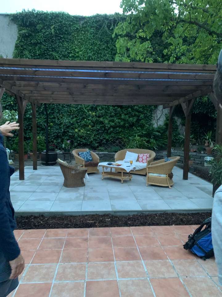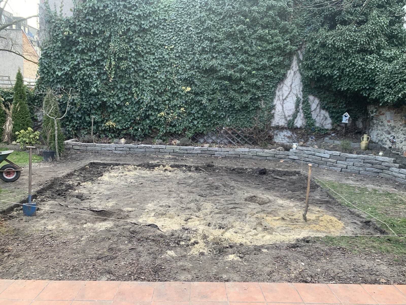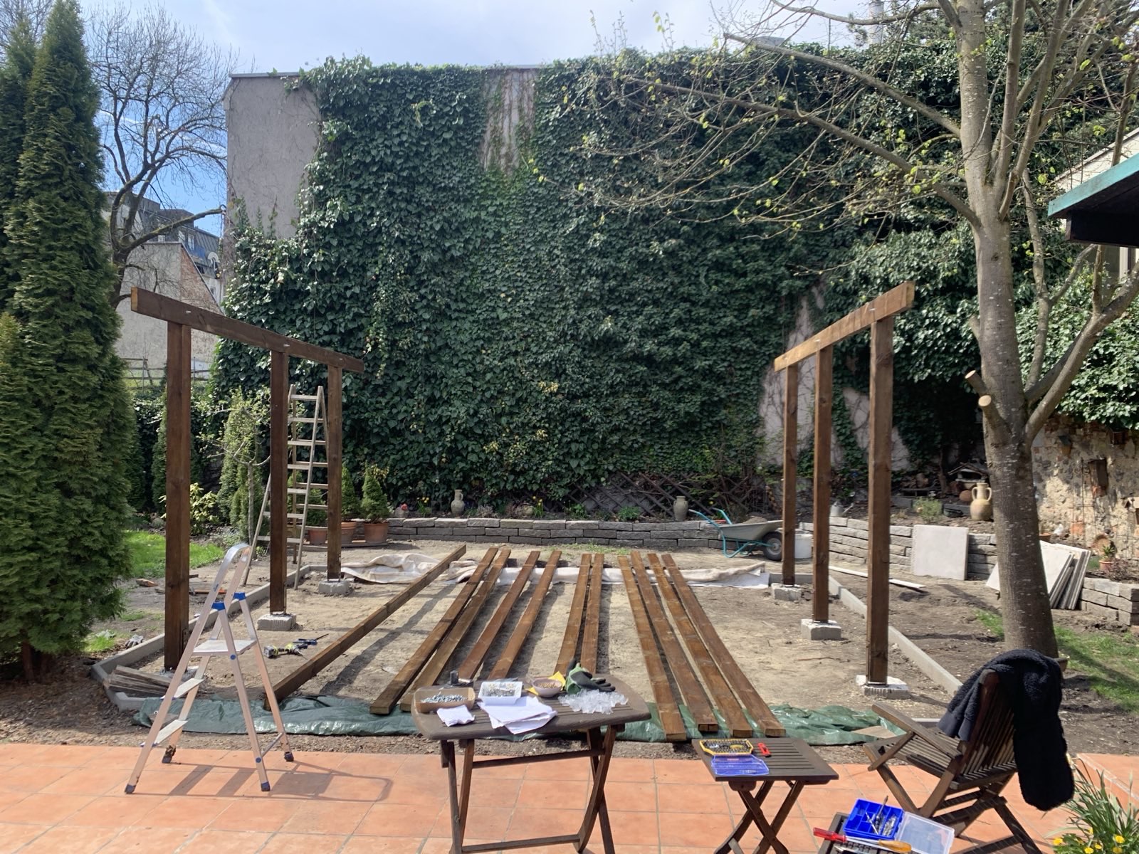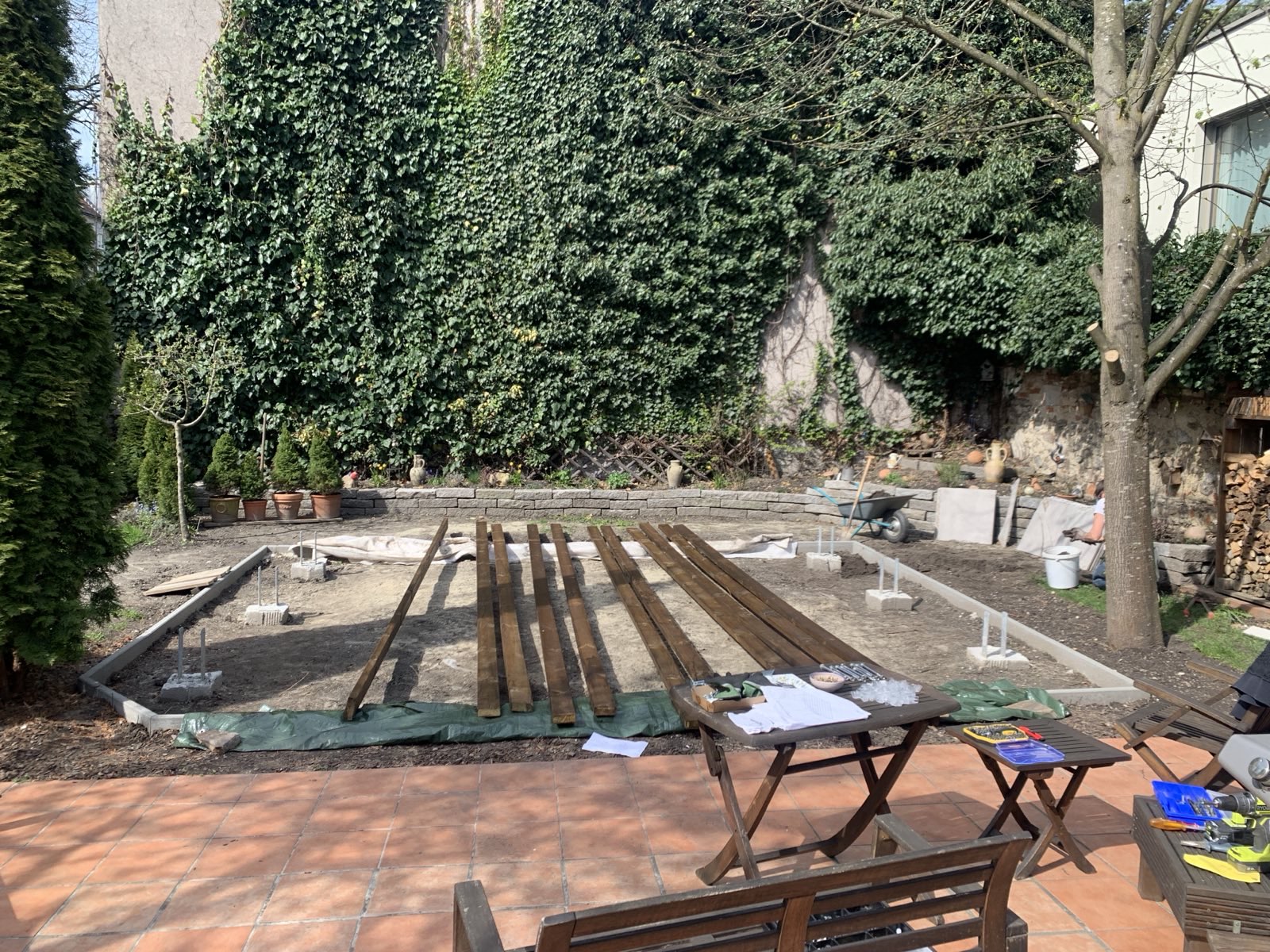 Es gibt Anlässe da kann die größte Pergola nicht groß genug sein, also muss ein Carport angeschafft werden um das ChampionsLeague-Finale im richtigen Rahmen zu sehen. Die Sandkiste der Kinder musste weichen um an ihrer Stelle die Fundamente herzustellen und einen Feinsteinzeug-Platten-Belag einzubauen.